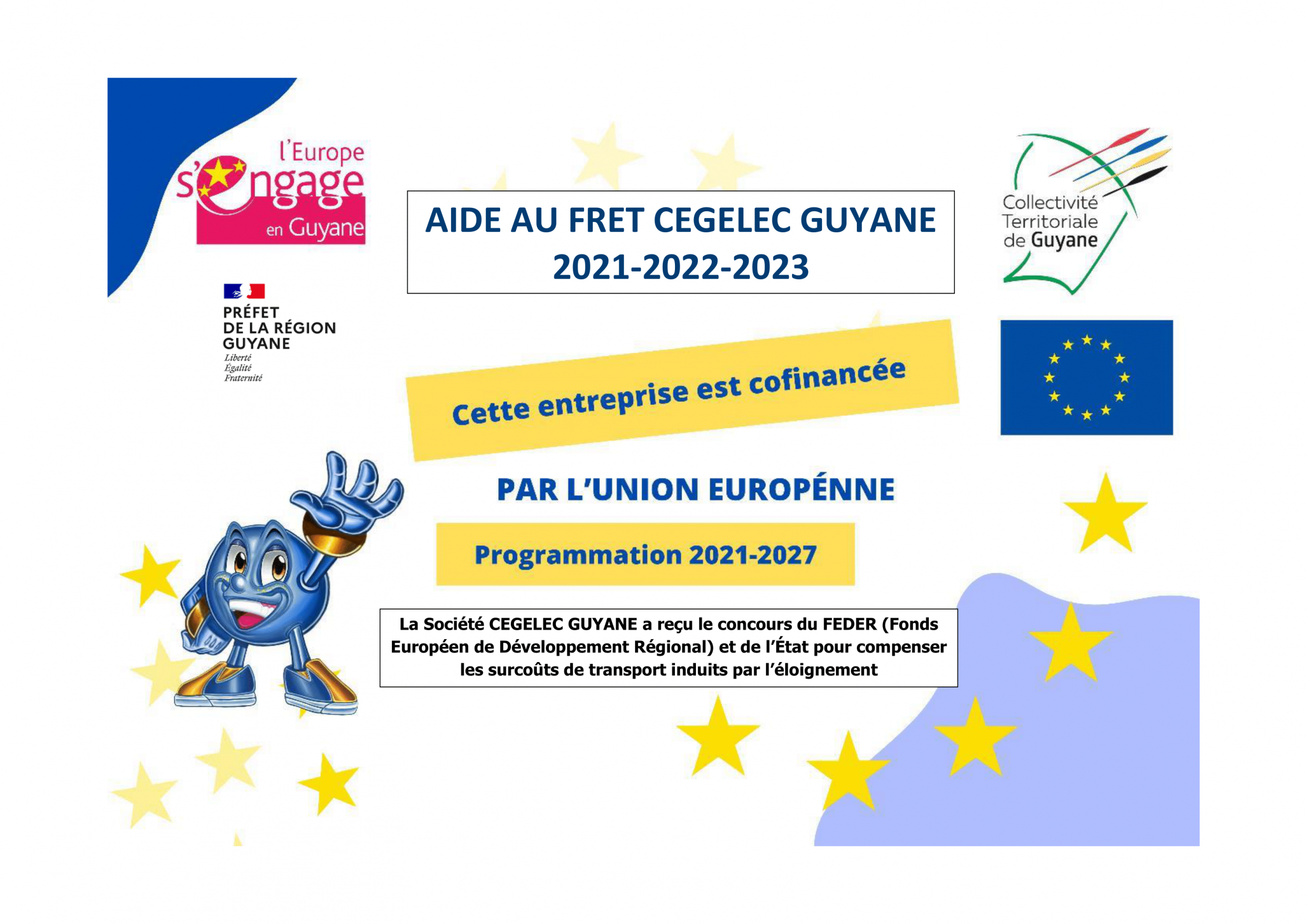 CEGELEC GUYANE a reçu le concours du FEDER (Fonds Européen de Développement Régional) et de l’État pour compenser les surcoûts de transport induits par l’éloignement.